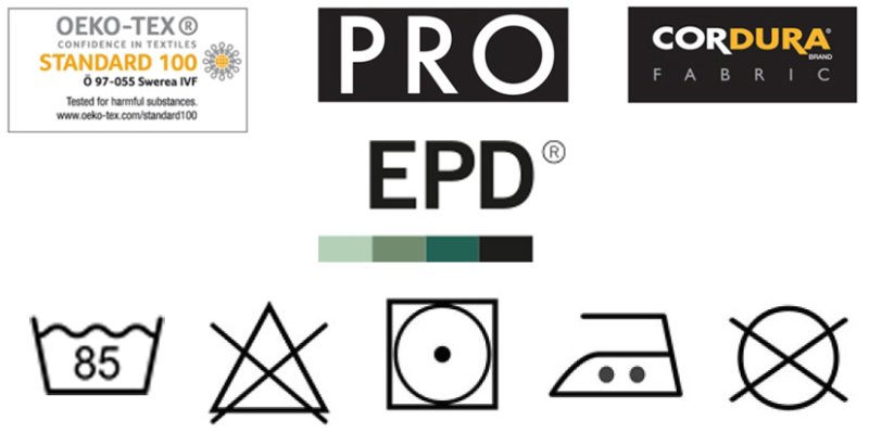 Lavage normal à 85°C, Ne pas blanchir, Séchage par culbutage possible jusqu'à 60°C, Repassage à une température maximale de 150°C, Ne pas nettoyer à sec