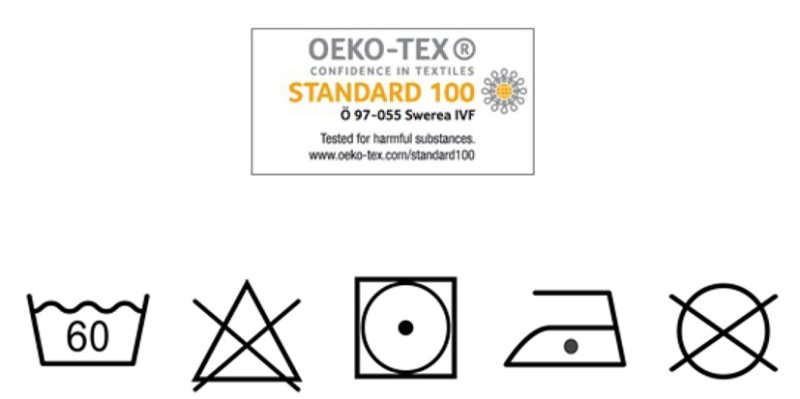 Lavage normal à 60°C, Blanchiment interdit, Séchage en machine possible, basse température, Repassage à une température maximale de 110°C, Nettoyage à sec interdit